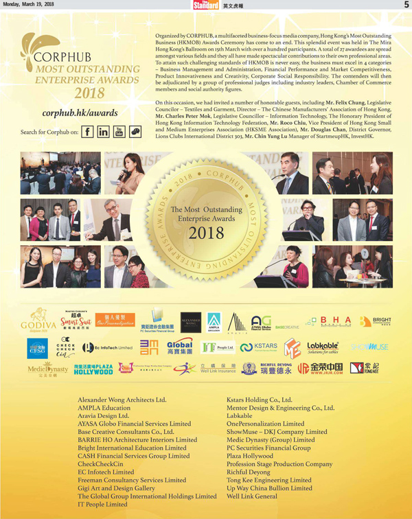 香港《星岛日报》在2018年3月19日刊载2018年度杰出企业得奖名单