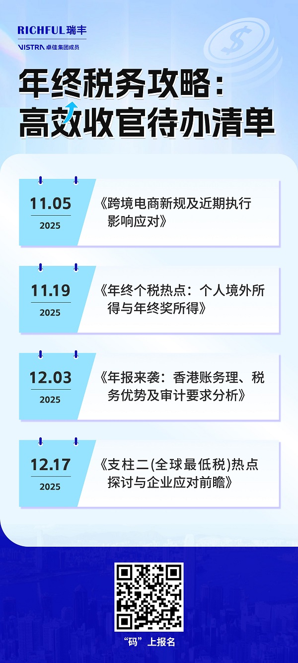 岁末将至,面对纷繁复杂的税务政策与紧迫的年度收官工作,您是否正在寻求一份清晰高效的行动指南?我们精心策划 “年终税务攻略:高效收官待办清单”系列网络研讨会,直击四大关键议题,助您系统梳理合规路径,优化财税布局,为2025年的稳健发展奠定坚实基础。