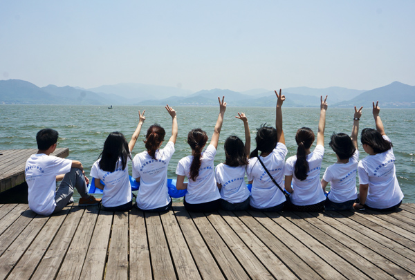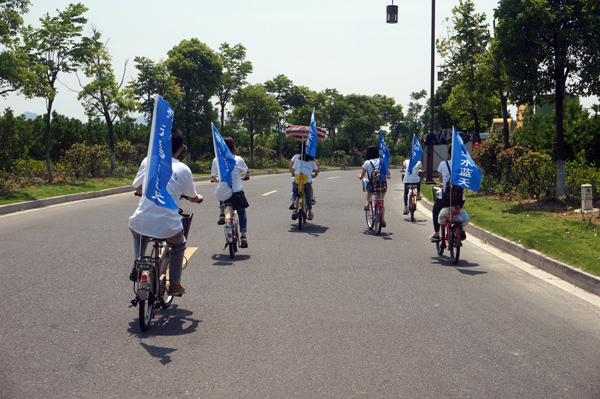 上午9:40活动正式开始,我们从东钱湖游客中心出发,每辆车后面都打出了统一旗帜,展示环??诤?,吸引了不少路人的驻足观看。