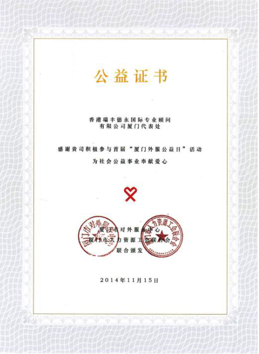 主办单位:厦门对外服务中心颁发公益证书