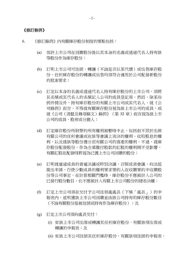 《公司条例》(第622章)已作出修订,为上市公司引入新的库存股份制度,让上市公司可以库存方式持有和处置回购的股份。在《2…