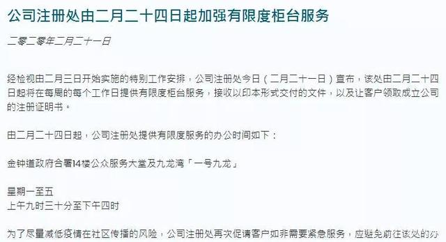Ïã¸Û¹«Ë¾×¢²á´¦·¢²¼ÐÂÎŹ«±¨Ðû²¼£¬ÓÉ2ÔÂ24ÈÕÆð¼ÌÐøÌṩÓÐÏ޶ȹñ̨·þÎñ£»½ö½ÓÊÜÓ°Ó¡ÎļþÌá½»£¬¼°°ìÀí¿Í»§ÁìÈ¡³ÉÁ¢¹«Ë¾×¢²áÖ¤Ã÷Êé ¡£