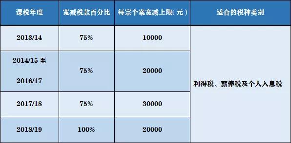 最新新条例将落实政府在2019年提出的税务宽免,即宽减2018/19课税年度100%的薪俸税、个人入息课税及利得税,每宗个案以20,000元为上限。