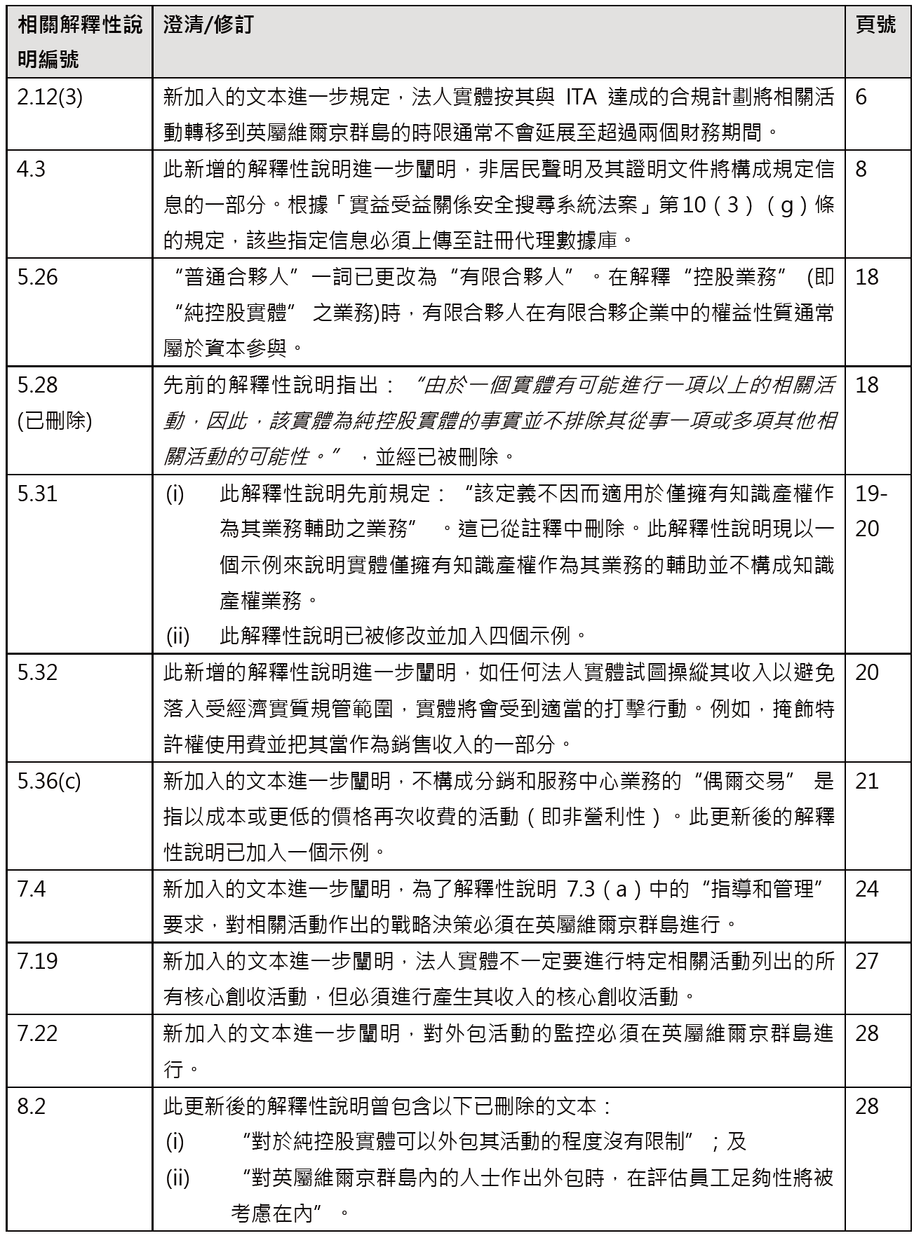 随后,BVI国际税务局(「ITA」)於2020年2月10日颁布了最新版本的《经济实质守则》(“经修订守则”)。经修订守则為法案提供了更详细的解释和阐述。於2019年《实益受益关係安全搜索系统(修正案)(第3号)法》生效时,经修订守则亦正式生效。 经修订守则与前版本没有太大区别,但仍有必要了解载列於本文附录中的主要修改。