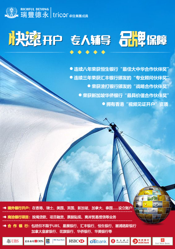 随着世界银行局势的收紧,国际反洗钱规定和众多多边协定的签订,开设境外银行账户变得越来越困难,瑞豐德永拥有多年开户经验及与香港银行有良好合作关系,香港公司及离岸公司最快可以做到一两星期就可以成功开户!这不仅仅能够给高净值人士带来多国家多地区的开户选择,更能为其提供全面的开户前期审核指导服务,使大家境外银行开户更高效。
