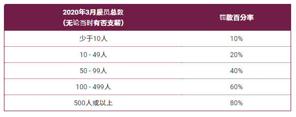??畎俜致适前垂椭饔?span lang="EN-US">2020年3月的雇员总数多少(无论当时有否支薪)订定,即雇员人数愈多,罚款百分率愈高: