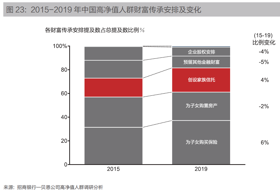 根据《2019中国私人财富报告》显示,家族信托在高净值人士的各类财富传承安排方式中增长最快,提及率从2015年的16%提升至2019年的20%。可见,家族信托所具备的税务筹划、财富保障与传承功能的优势越来越受到重视。
