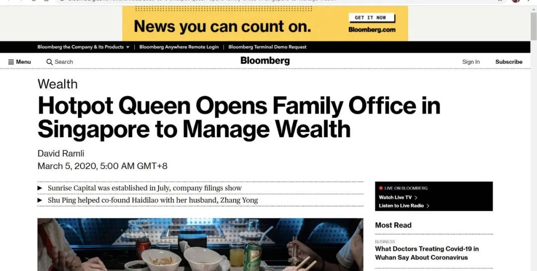 2020年3月5日彭博社Bloomberg在财富专栏的一篇报导《火锅女王在新加坡设立家族办公室以管理财富》,迅速将全球最大的火锅连锁店海底捞送上了热搜。