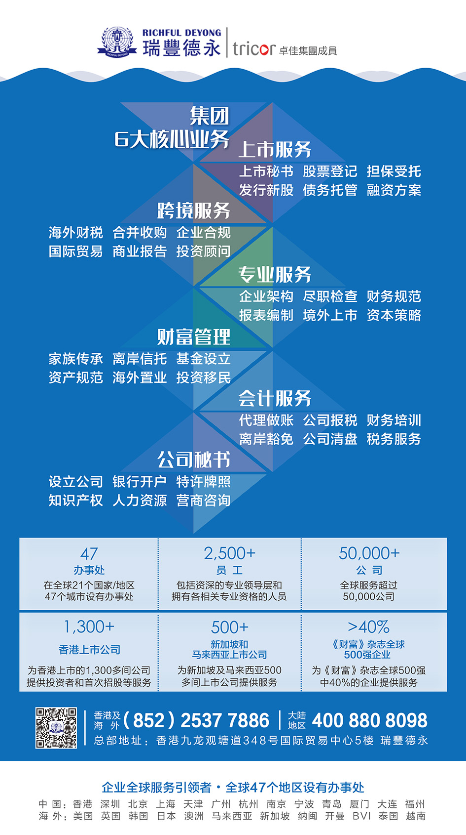 因此如您有上述需要,一定要寻找专业人士帮忙,寻找合规且有资质的专业代理商可事半功倍。瑞豐德永,作为企业全球服务引领者,在海外基金设立、资产规范、税务规划、企业架构等方面拥有丰富的经验,用最专业的服务,为您私人订制最适合的方案,确保合法、合规且保密。