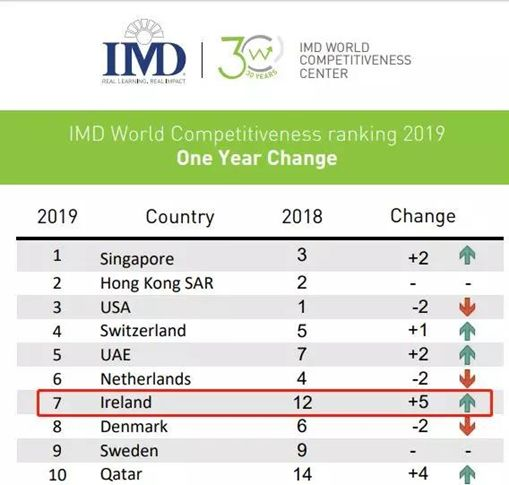 长期以来,爱尔兰一直被视为通往欧洲市场及其5亿人口的门户,经济方面,在瑞士洛桑国际管理发展学院(IMD business school)发布《2019年世界竞争力报告》排名中,爱尔兰跃升至第七位,在欧盟成员里面排名第二!