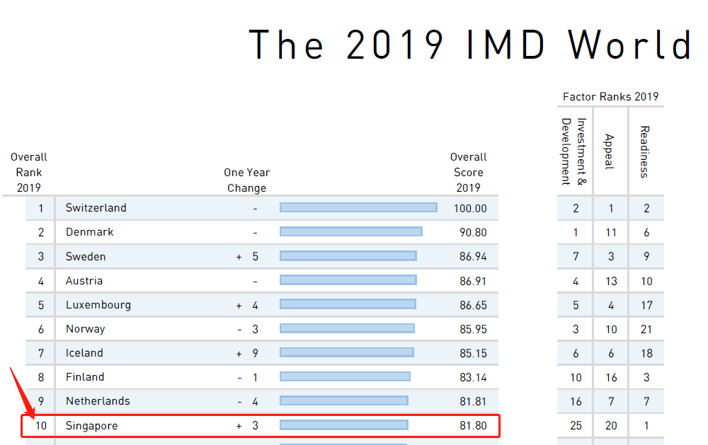 在2019年,排名榜首的仍然是欧洲中小型经济体,这些国家在教育和高品质生活方面的投资水平很高。排前九名的都是欧洲国家,新加坡是唯一跻身前10的经济体,与去年相比,新加坡排名上升了三位。