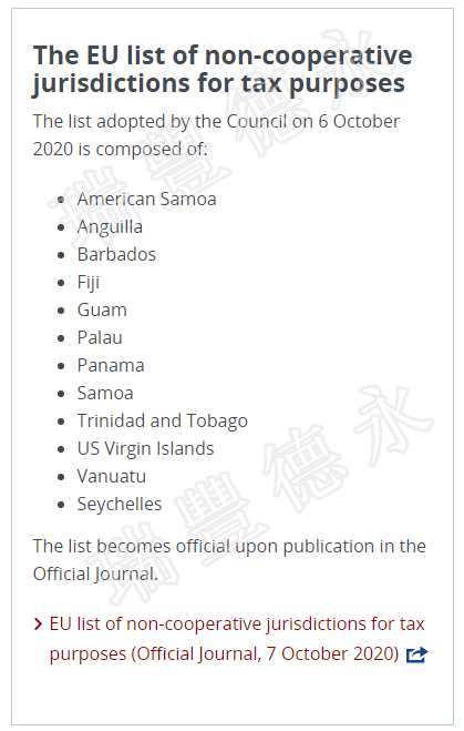 目前欧盟税务不合作黑名单包含12个国家或地区:美属萨摩亚(American Samoa)、安哥拉(Anguilla)、巴巴多斯(Barbados)、斐济(Fiji)、关岛(Guam)、帕劳(Palau)、巴拿马(Panama)、萨摩亚(Samoa)、塞舌尔(Seychelles)、特立尼达(Trinidad)和多巴哥(Tobago)、美属维京群岛(US Virgin Islands)和瓦努阿图(Vanuatu)。