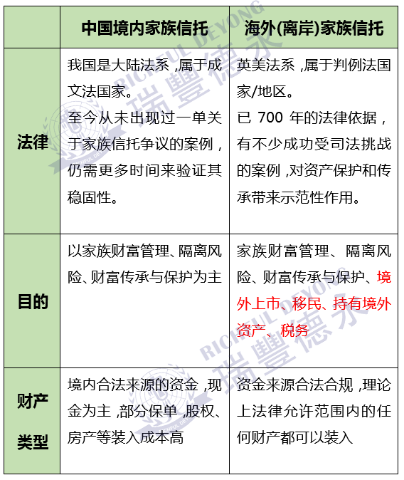 此前瑞豐德永也为大家对比过中国内地家族信托与境外家族信托的区别。境外家族信托其实除了在上述税务筹划方面占优势之外,更有法律层面、目的、装入财产类型等方便优势,请看下表↓