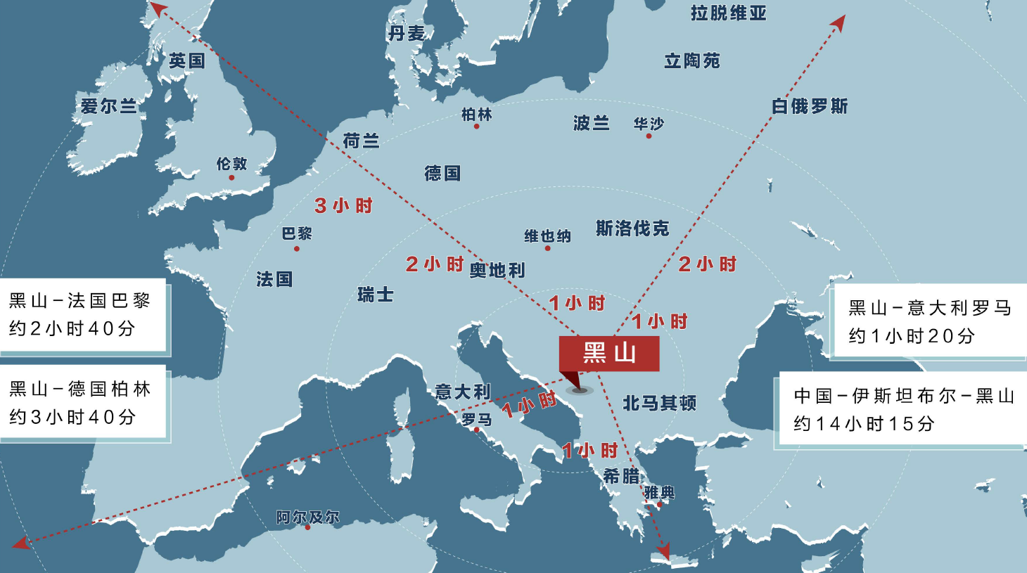 黑山毗邻地中海,所处欧洲东南部,4小时的飞行圈几乎可涵盖欧洲所有国家。