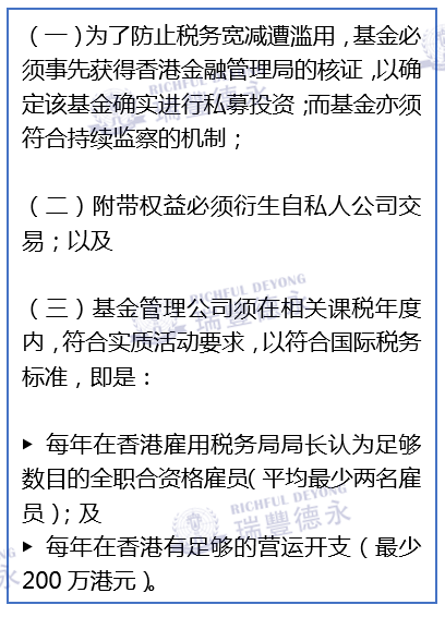 目前为了进一步香港巩固香港私募基金枢纽的优势,特区政府立法会将实施当初承诺的第二步骤:为在香港营运的私募基金所分发的「附带权益」提供税务宽减。但有关附带权益必须符合若干条件,方可获得税务宽减,其中包括: