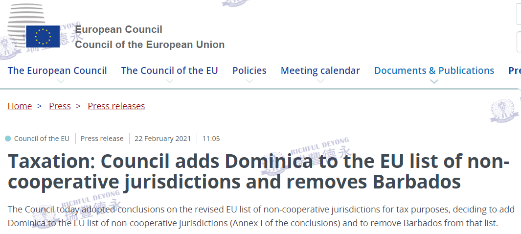 2021年2月22日,欧盟理事会在其官网上发布一则公告:就经修订的「出于税收目的的欧盟非合作管辖区清单」(俗称“黑名单”)通过了结论,欧盟决定将多米尼加(Dominica)加入该名单中,同时将巴巴多斯(Barbados)移出“黑名单”。