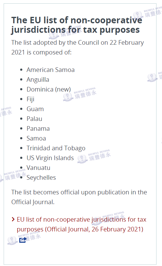 综上,随着全球反避税力度的加大,加下来欧盟理事会针对避税黑名单制度有可能会做出较大改变,瑞豐德永将会对此密切关注,随时跟进最新内容。对于以上内容,若您有相关业务评估需求,详情可以与我们取得联系。