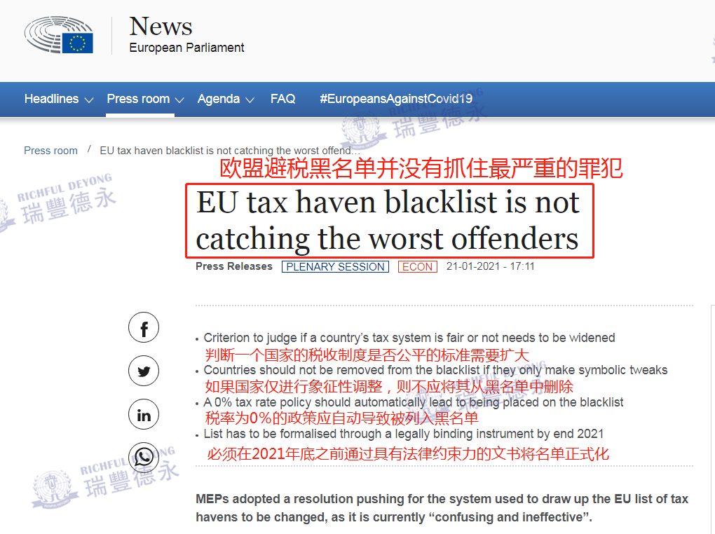 ?? 值得一提的是,在2021年1月21日,欧洲议会通过了一项决议,要求理事会和欧洲委员会改革欧盟税收黑名单,并要求更新清单标准和采取更加协调一致的防御措施(更多细节)。