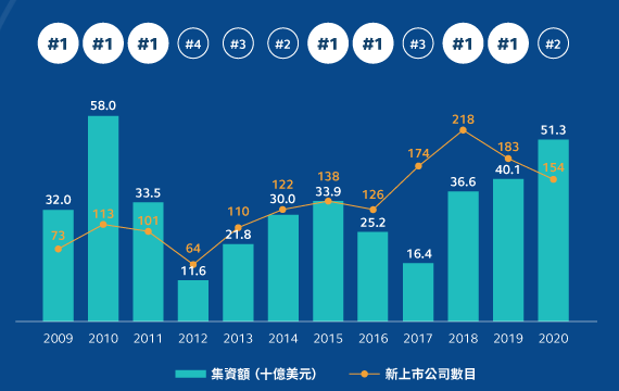 2020年尽管环球市场波动异常,但是港交所的一级市场仍领先全球IPO集资榜,共有154家公司在香港交易所上市,2020年首次公开招股集资额位列全球第二,集资金额达3,975亿港元,是2010年以来最高。