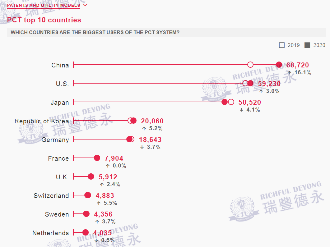 其中,来自中国的申请人提交的PCT申请量最多,达68,720件申请,同比增长16.1%,有史以来第一次超过美国成为PCT体系的年度最大用户。中国,美国,日本,韩国和德国位列前五名。