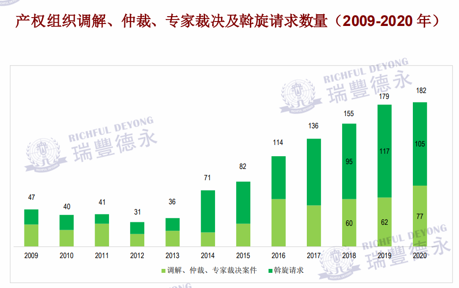 根据世界知识产权组织发布的最新数据显示,自2013年以来,世界产权组织调解、仲裁、专家裁决及斡旋请求数量逐年增长,2020年创下新高一共182件,调解、仲裁、专家裁决案件77宗,斡旋请求105宗。