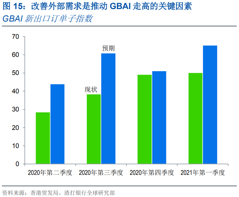 全球通货再膨胀背景,尤其是在疫苗的迅速推广以及美国即将出台的新一轮财政刺激计划的推动下,帮助提升新了企业出口订单的前景,在国内强劲复苏的同时,提振大湾区表现突出的制造业(图 15)。