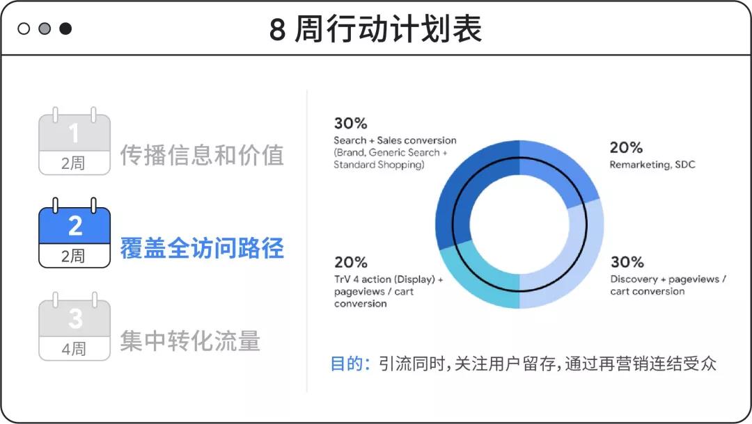 这个周期要把用户沉淀下来,收集再营销列表重新把用户拉回来并保持一定比例品牌传播的预算