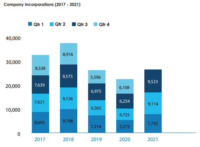 2021年第一季度,BVI公司注册数量7732家,同比增长46.58;