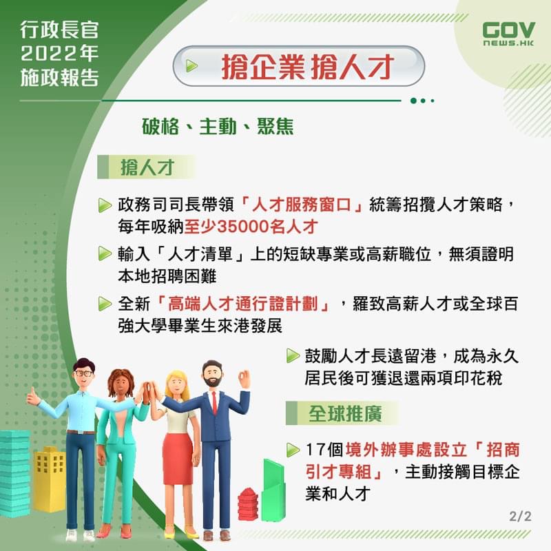 2022年10月19日,香港新任特首李家超发布第一份《施政报告》,李家超在施政报告中提出一系列新措施,招商引资引才,强化香港竞争力。香港政府将成立多个单位,专责招揽企业和人才来港发展,并优化多项输入人才计划,加强吸引力。