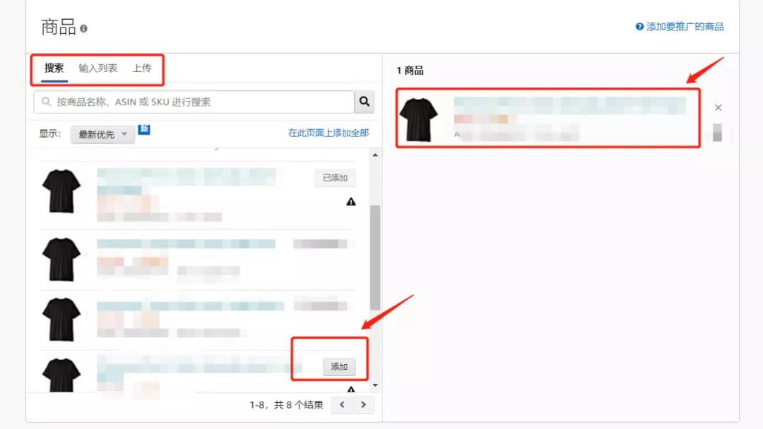 ①搜索:直接在搜索框中输入商品名称、ASIN、SKU,搜索出需要投放的商品,点击商品右边的【添加】即可。