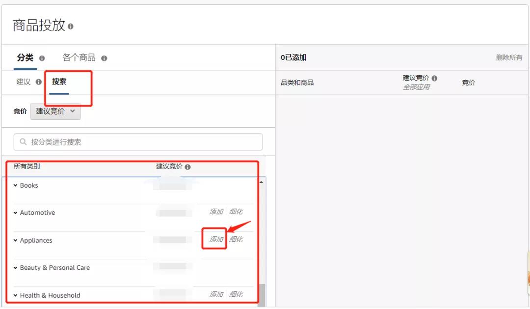 您也可以按照搜索方式,选择“搜索”字段下方列出的品类,进行添加,设置合适的出价。