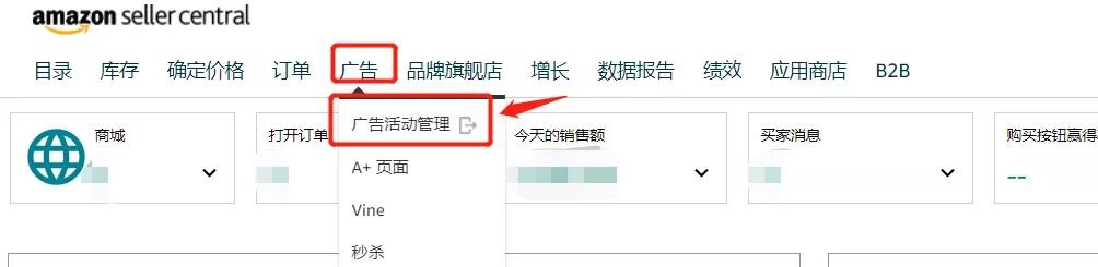 第一步:打开亚马逊卖家后台,找到工具栏中的【广告】——【广告活动管理】。