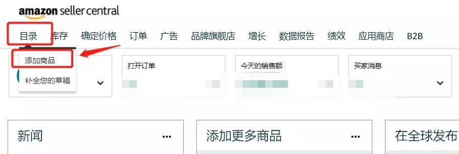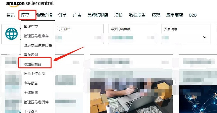 打开亚马逊卖家后台,点击添加新商品按钮,这边有两种渠道方式: