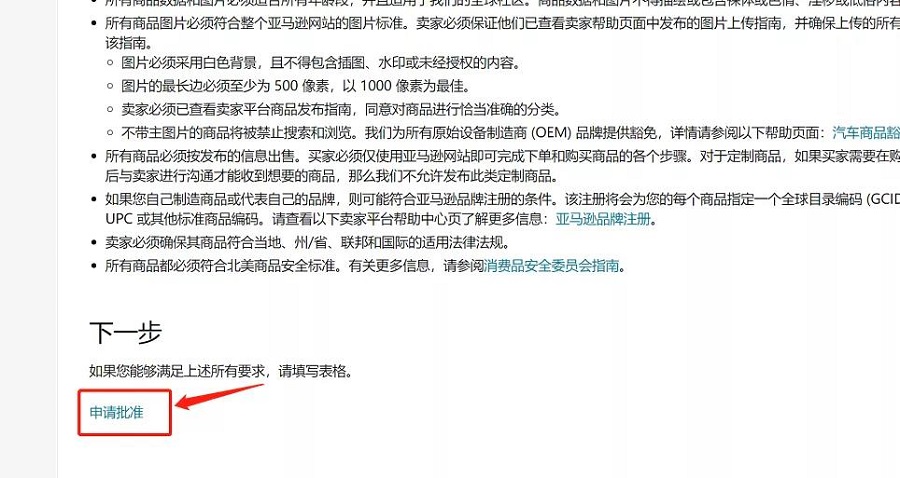通过上面讲到的ASIN查询方法,在产品的下方,点击了解更多,拉到页面的最下方,点击“申请批准”。