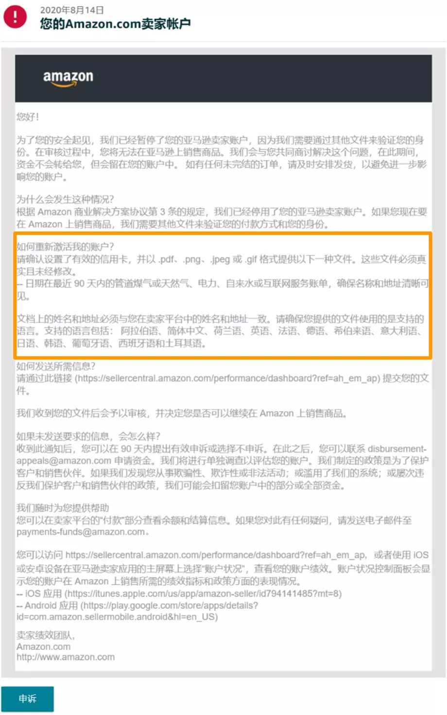 如果在未超过五个工作日内重复提交文档,或将您的申诉由其他渠道发送至亚马逊,亚马逊有可能将您的多次重复申诉识别为垃圾邮件而延迟对您的回复