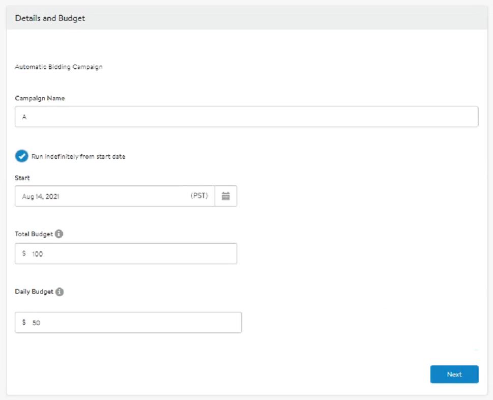 第 4 步:如图4所示,输入活动名称并设置开始日期。你可以在此处选择广告的总预算以及每日预算。总预算必须至少为 100 美元,每日预算必须至少为 50 美元。