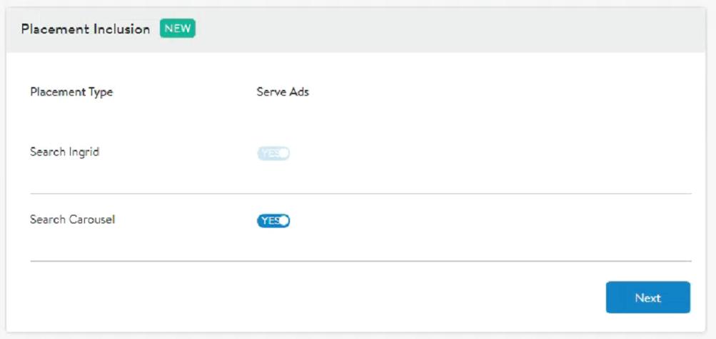 第 5 步(仅适用于手动广告):如图5所示,利用选择展示位置包含的新功能,选择称为Search Ingrid和Search Carousel的两种展示位置类型。Search Ingrid默认开启,无法关闭。Search Carousel是可选的,但强烈建议扩大覆盖面,并且仅适用于基于关键字的广告系列。此选项在搜索页面上的搜索轮播广告中展示产品。