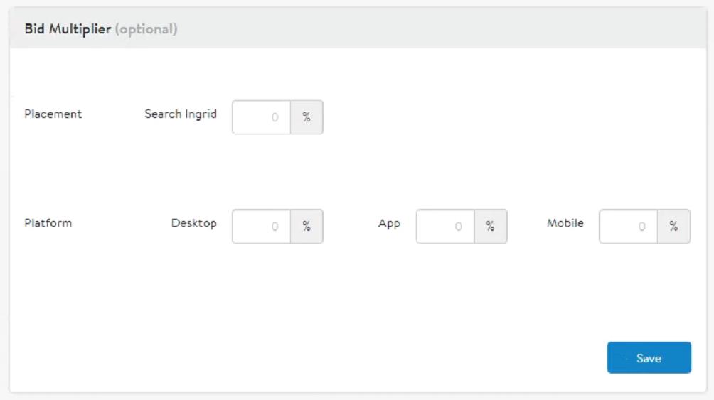 你可以选择在购买按钮(仅限自动广告)和搜索展示位置上设置出价乘数。此外,你可以选择你的Walmart广告显示在桌面设备还是移动设备(App or Mobile)上。