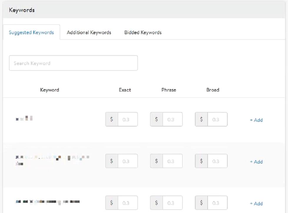 第 8 步(仅限手动广告):如图9所示,你可以在此处输入所需的关键字??梢允褂肳almart推荐的建议关键字,也可以上传你自己的关键字列表。你还可以在此处选择你愿意为每个关键字花费的CPC出价。