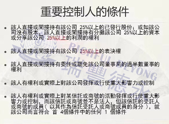 这里需要重点关注一下“公司指定代表”的几个重要条件,现在市场很多小的香港公司注册中介和代理可能无法达到上述要求,因此在办理“备存重要控制人登记册”的时候,一定要找符合条件和资质的机构来做,否则可能出现钱花了事情未办妥的情况。