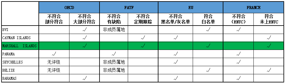 目前,在国际上对于离岸属地进行合规评级的主要有欧盟ECOFIN,国际经合组织(OECD)以及反洗钱金融特别工作组(FATF)。而在国内常见的离岸属地中,同时加入各机构评级又都在白名单上的海外属地只有马绍尔群岛
