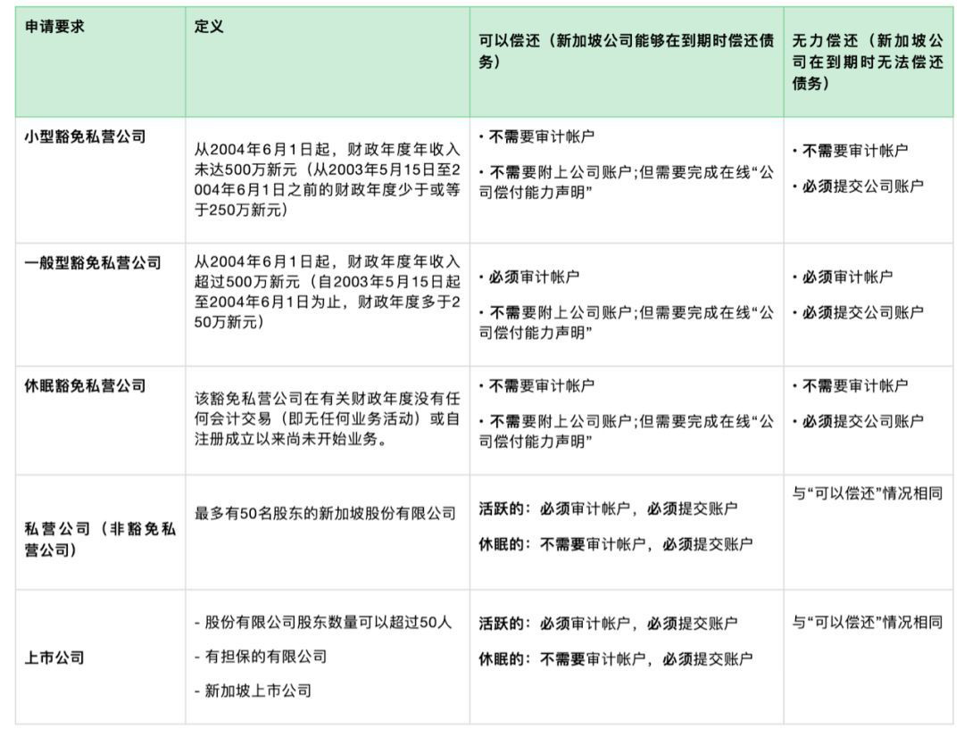 在新加坡,不同类型的本地公司提交年报的要求不同,总的来讲会分为可以偿还(新加坡公司能够在到期时偿还债务)及无力偿还(新加坡公司在到期时无法偿还债务)两种情况。