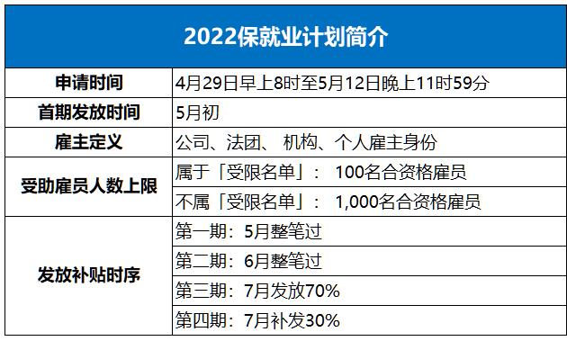 香港启动“2022保就业”计划,并于4月29日至5月12日接受申请,为期两周,预计首批资助在5月初开始发放。计划总财政承担约430亿港元,将惠及约160万名雇员及约14万名自雇人士。