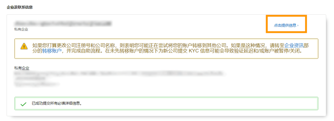 ② 单击法人实体名称旁边的“点击提供信息”,以便您可以更新法定企业名称;