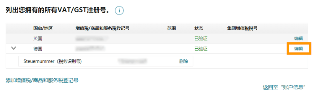 ② 单击关联的增值税税号旁边的“编辑”按钮;