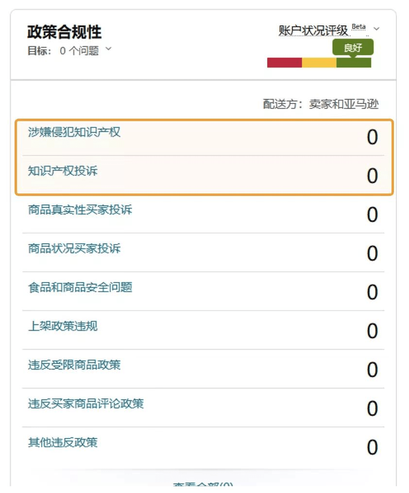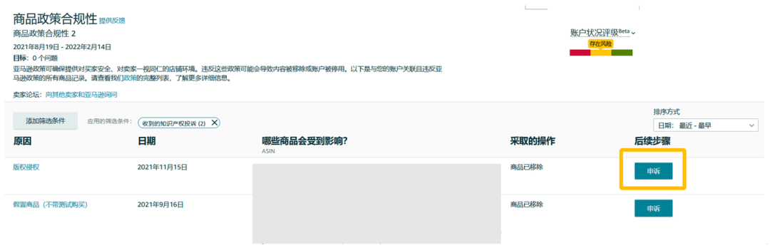 通过“商品政策合规性”页面,您可以看到违反亚马逊政策的商品记录。当您看到“涉嫌侵犯知识产权” 、 “知识产权投诉” 两栏内容有警示,则意味着可能存在侵权问题。接下来您可以对该页面中显示的违规问题进行申诉。