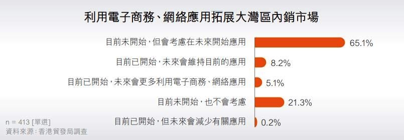 电子商务及网络应用近年急速发展,通过互联网的各种电子交易盛行,包括供应链管理有关的电子数据交换应用,以及网络行销和网购活动等大行其道。虽然如此,受访企业当中,只有不到14%受访企业表示目前已开始利用电子商务、网络应用拓展大湾区的内销市场,包括8.2%未来会维持目前的应用,及5.1%未来会更多利用电子商务、网络应用。虽然如此,大部分受访企业表示会考虑在未来开始应用(65.1%),只有21.3%表示目前未开始、也不会考虑有关应用。