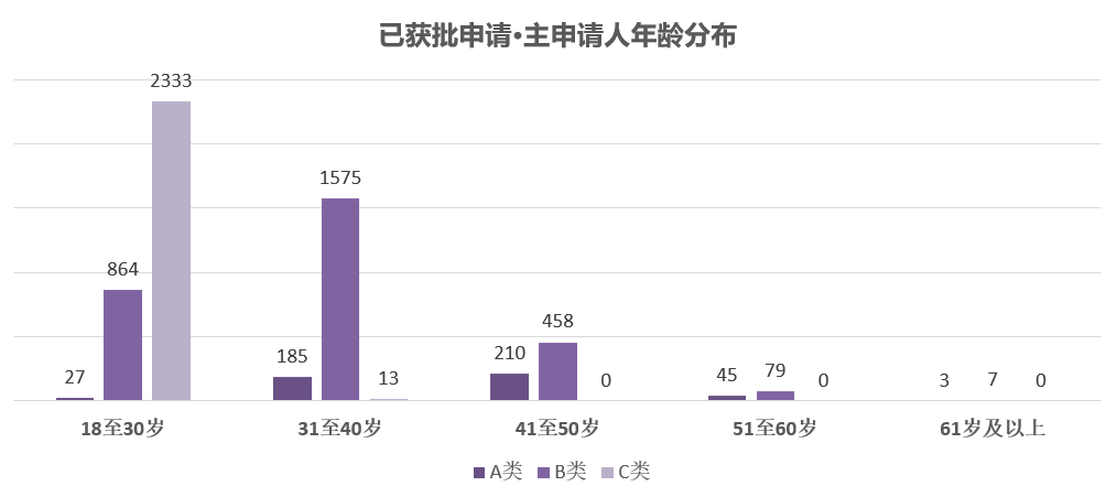 从年龄维度对三类申请的主申请人情况进行数据统计,得出如下分布: