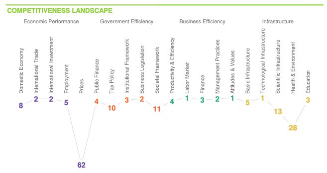 全球竞争力报告报告覆盖了全球67个经济体,并对这些国家在经济表现、政府效率、商业活力和基础设施建设等四大领域的表现进行了全面的评估,包含了164项竞争力指标。