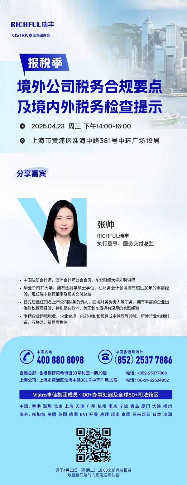 为帮助您更深入理解境外公司税务合规要点,精准把握境内外税务检查关键,我们诚挚邀请您参与以下专业活动。在活动中,您将获得行业前沿的税务知识与实操技巧,助力企业从容应对复杂多变的税务环境。